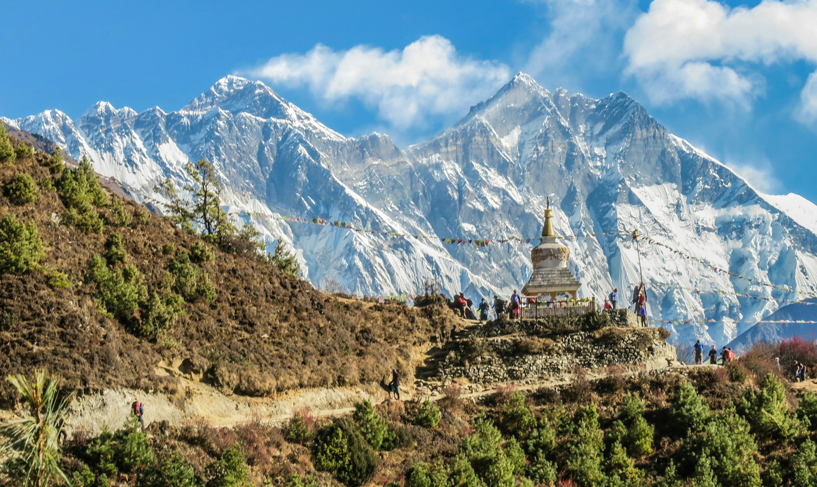 Namche Bazaar is the Sherpa capital and gateway to Everest. This impressive village was a trading center for Tibetan Yak caravan trading. The Tibetan traders bring wool, butter, yak and sheep meat, salt and Chinese manufactured goods on yak caravans over the Nangpa La (5800 m/ 19000 ft) and sell them at Namche Bazaar. Today Namche Bazaar is a trekkers’ hub with trekking equipment shops, banks, ATM machines, internet cafes, bakeries, pubs and restaurants.