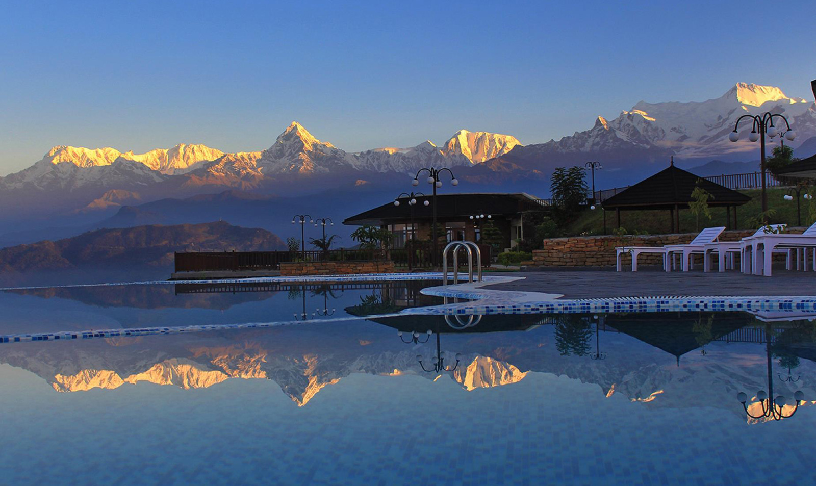 Sarangkot Mountain Lodge: Located at the top of the hill at an altitude of 1600 meters (5250 feet), with a spectacular Himalayan backdrop, Sarangkot Mountain Lodge offers luxury and relaxation. The lodge is equipped with an infinity pool, body treatment massage rooms and a 360* view bar and lounge room. Rooms are elegantly furnished with antique and design furniture of great designers, in authentic & rustic style.